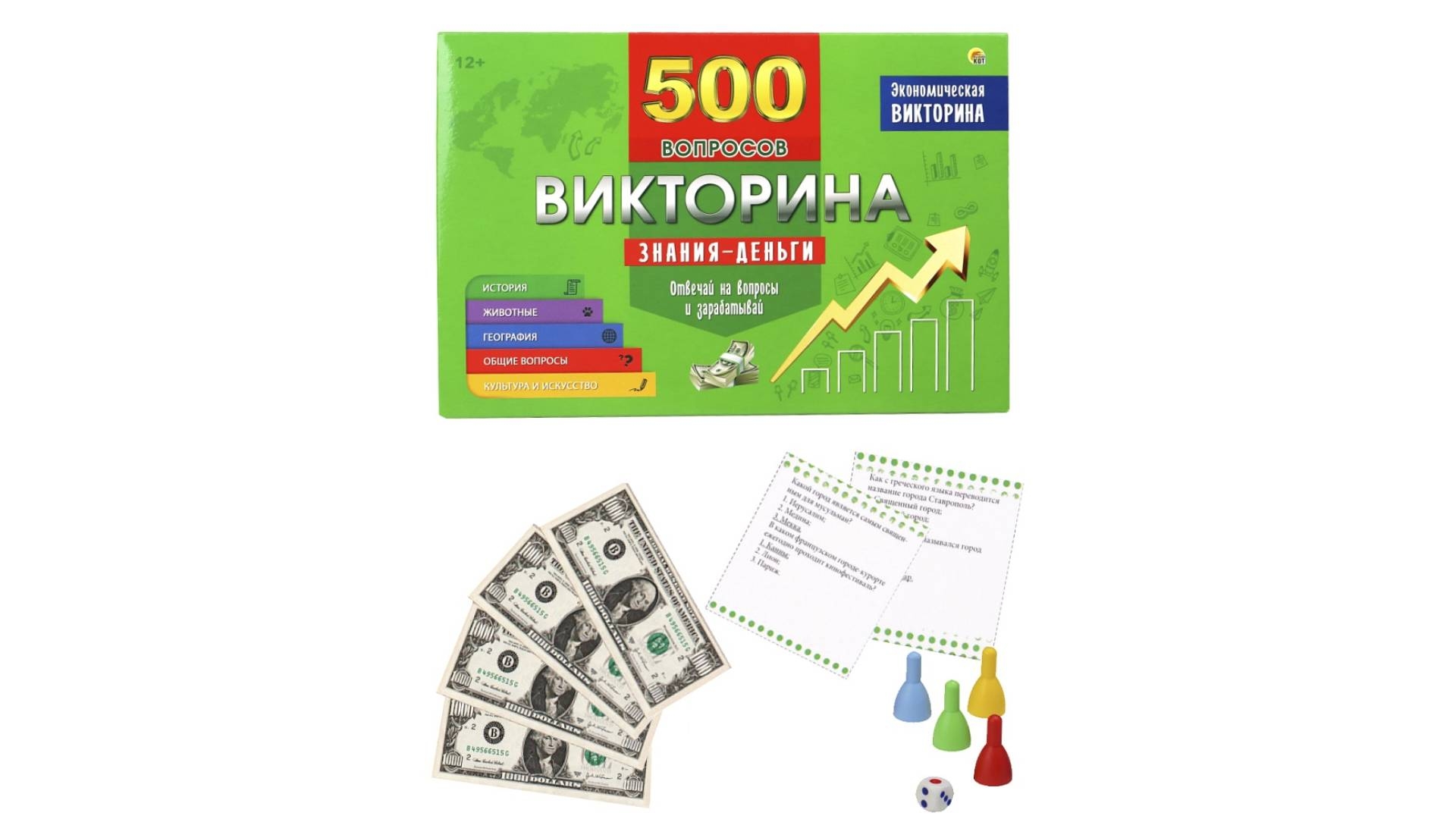 Красочная и яркая игра-викторина на 500 вопросов "Знания - деньги" — прекрасный способ весело и с пользой провести время! Такая интересная игра придется по вкусу как большой компании, так и парочке друзей. Она поможет выяснить, кто здесь самый умный, начитанный и эрудированный. Возрастное ограничение: 12+.