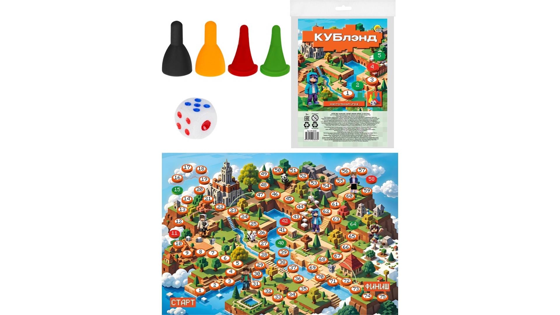 Что может быть интересней, чем игры с друзьями? «Кублэнд» — увлекательная настольная игра с невероятными приключениями для весёлого времяпровождения! А лёгкие правила игры осилят даже самые маленькие игроки! С такой настольной игрой ваш ребенок с пользой проведет свой досуг с друзьями, потренируется в знании цифр, простом счете, а также проверит свое везение.